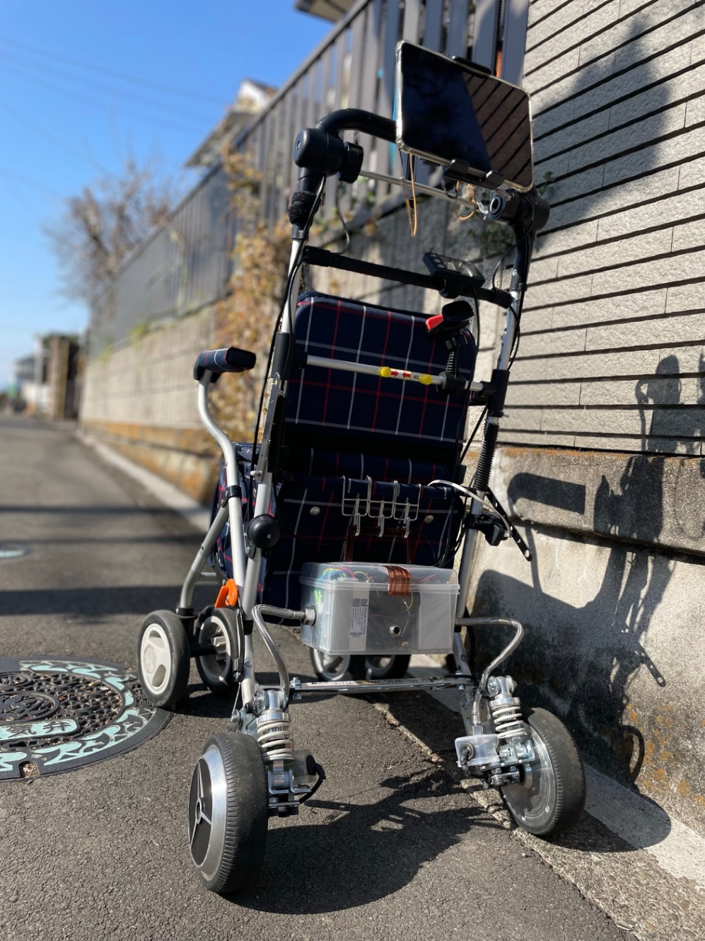- 3 ホイールベースが短くなり、後部が持ち上がったため、カート自体がかなり前傾姿勢となった。このため、eカートを押している時に足が当たることが多くなった。結果として、操作性が悪くなったと感じる。後輪の高さを調整したい。